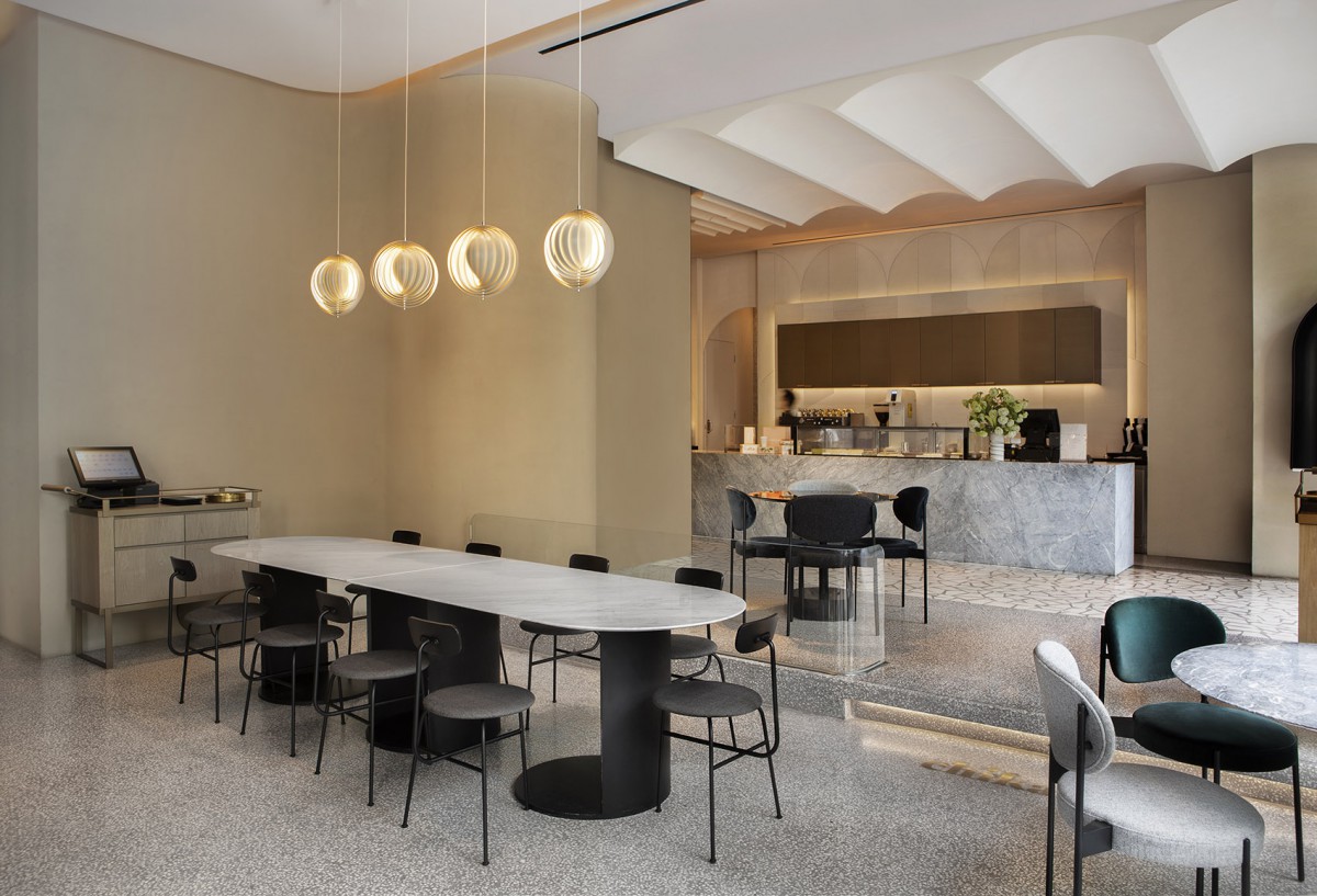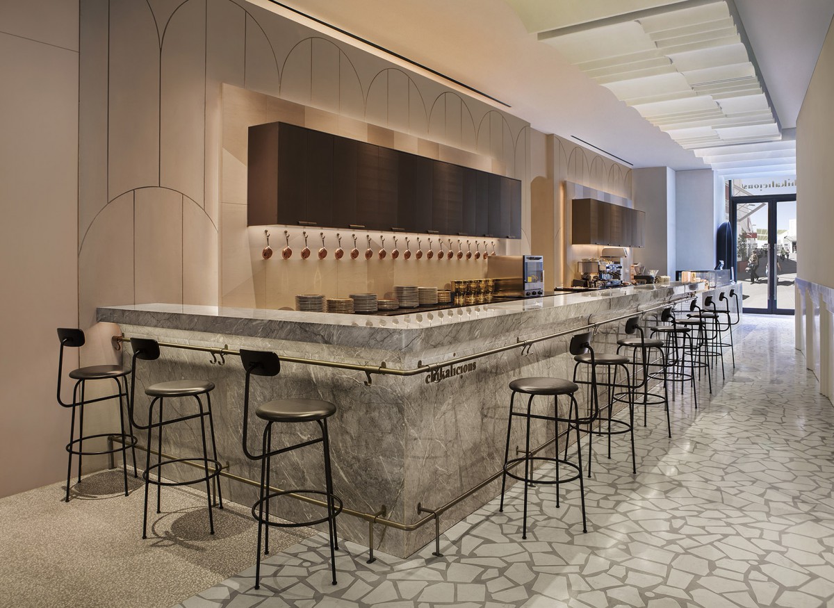 这家甜品店延续了纽约店铺的温馨舒适感。将公寓概念运用到不同的空间规划中去,我们依靠整个概念把空间相连,就像在设计自己的公寓一样每个“房间”有不一样的功能和造型,但是又必须是一体的,空间概念必须是完整的;
