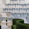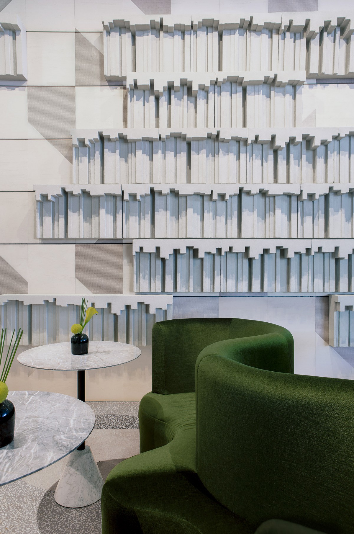 用抽象的雕塑表达想法,突破传统造型,增加了空间的趣味性。用书的负形表达书的功能符号;我们同时在空间中用了“窗帘”的元素符号去丰富空间的语言,把窗帘的现实造型映射在雕塑上,增加趣味性,将褶皱抽象化成不同弧长的凹形雕塑。天花和墙面都用了这一手法。