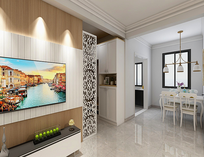 烟台装修效果图——157平米现代简约风格案例 鸿图装饰 在现代简约的装修风格,电视背景墙的理石铺贴尽显大气。金属线条勾勒出带有极简风格的空间,带有轻奢的韵味。整体看起来宽阔大气,也能体现主人高品质的生活品味。