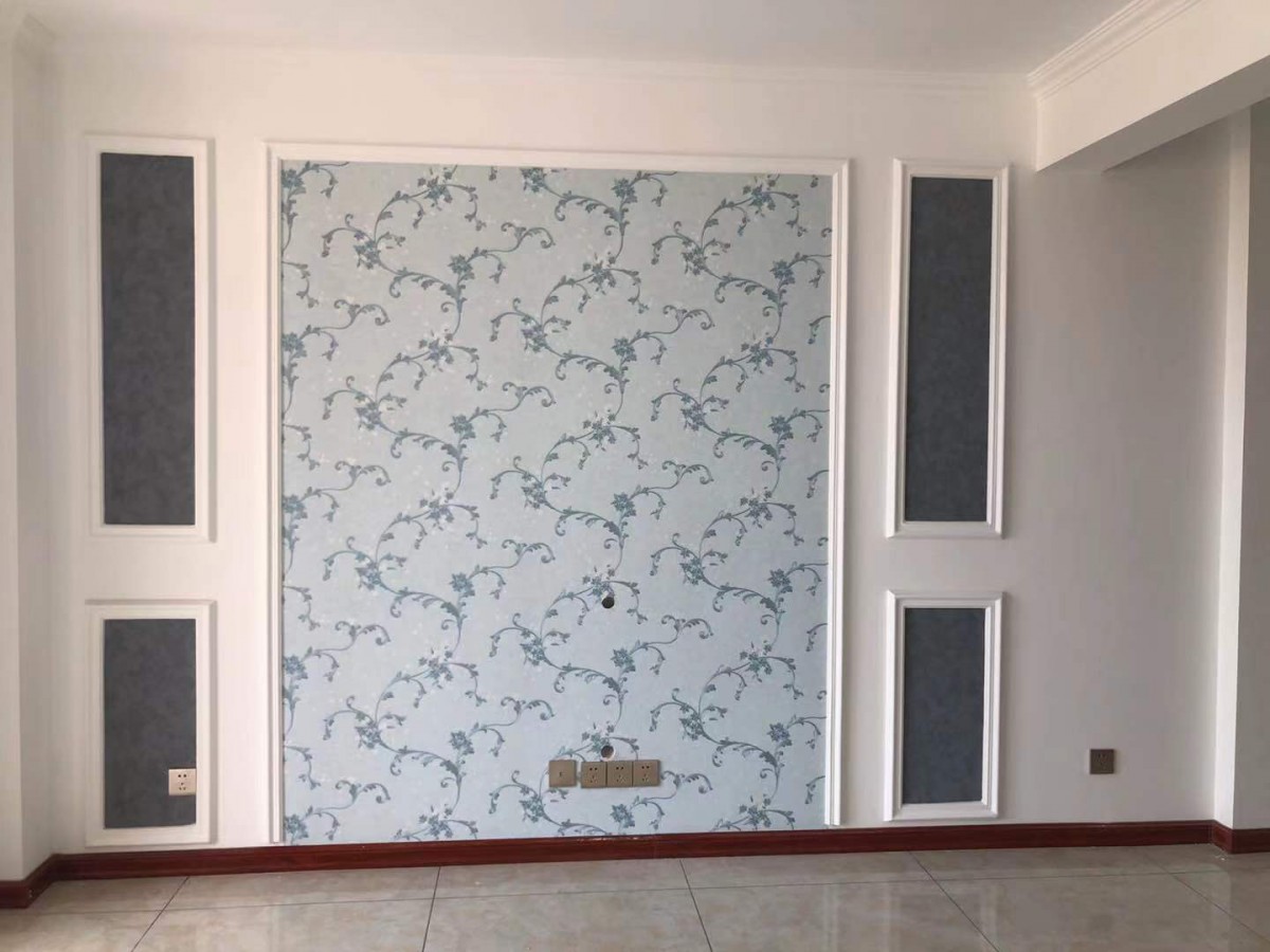 电视背景墙贴了蓝色印花壁纸,雅致大方