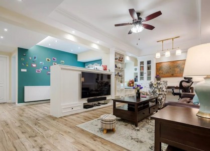 今天鸿图小编给大家分享一个120㎡的房子,以温馨优雅的现代美式风格装修,整个设计比较大胆,以矮墙作为电视墙,把客餐厅空间划