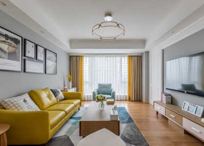 冷暖相称的基调,灰白对称的电视背景墙提升了整个空间的气质,与原木地板和家具搭配,构筑成自然质朴的专属格调。