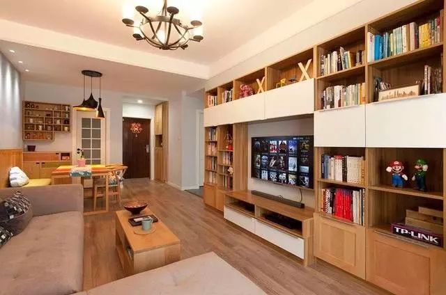 如果想实现将书房搬到客厅,但客厅又没有多余的位置,就让大书柜取代电视墙的装饰柜。