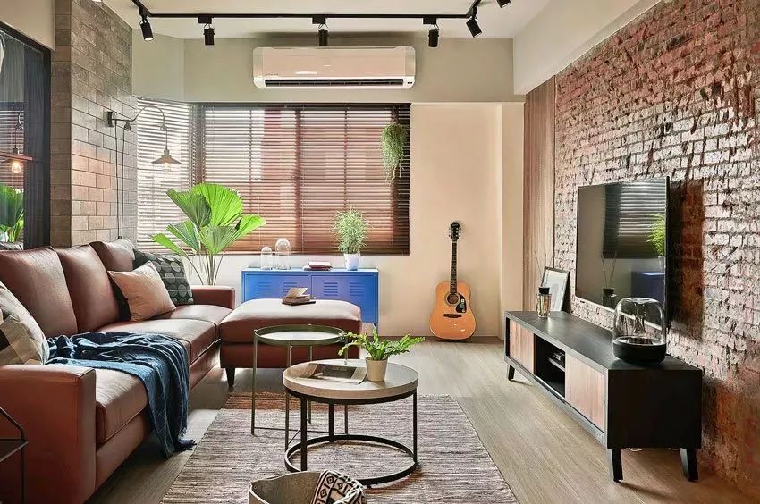 暖色调的客厅则让时光流转,回到过去,复古的斑驳墙面,复古感浑然天成。