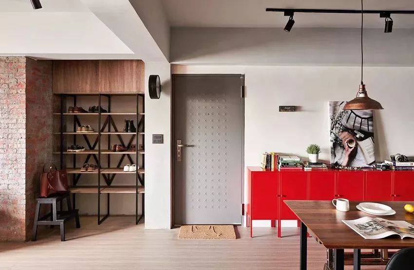 左边的原木风鞋架搭配红砖墙,精致与粗犷并存。右边的红色收纳柜则点亮了整个空间,达到了屋主想要的活泼效果。