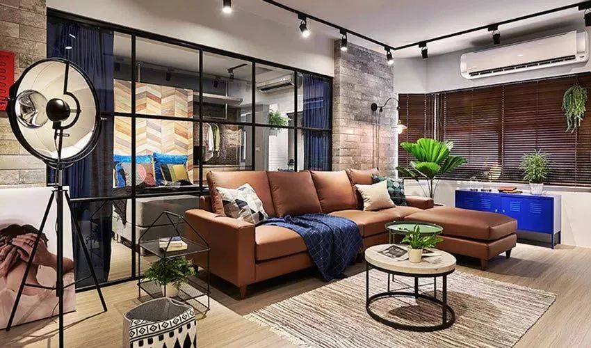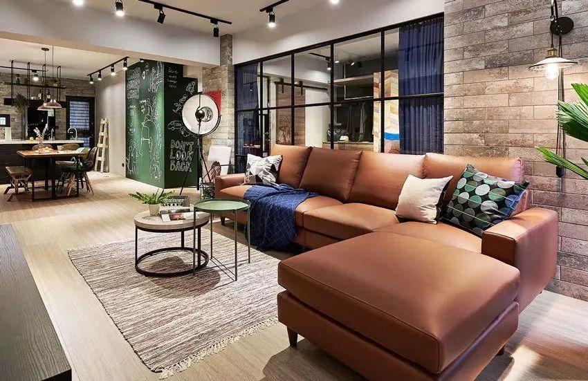 灯具、铁质茶几与沙发背后的黑边玻璃隔断则增强了硬朗感,凸显了屋主的个性。