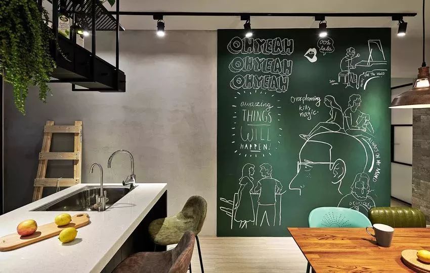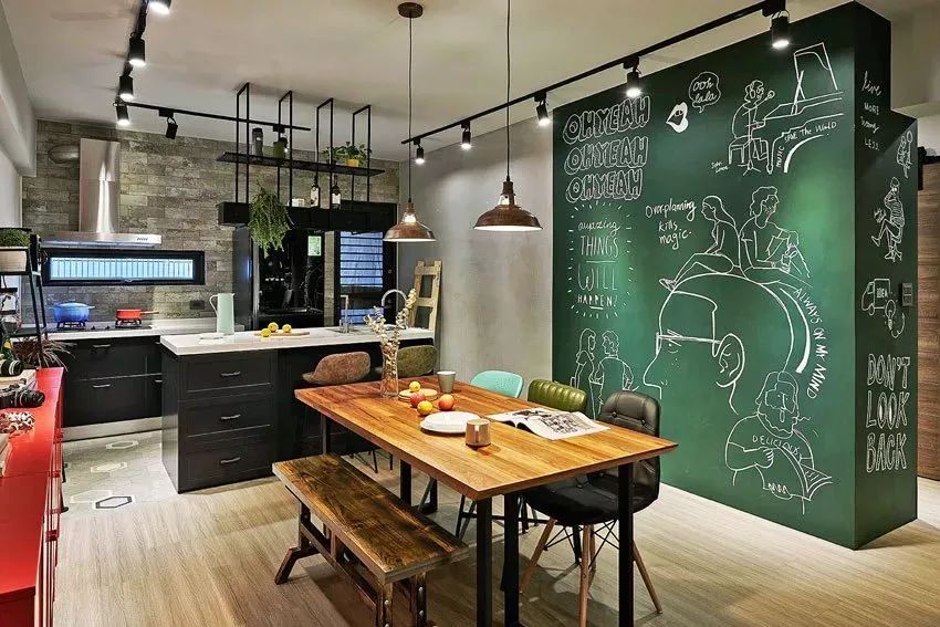 餐厅的墨绿色墙绘更是让人挪不开眼!考虑到屋主想要活泼的效果,设计师选择了黑板漆搭配手绘,增强了整个厨餐厅的艺术感,它的背面也是一个半开放式的收纳柜。