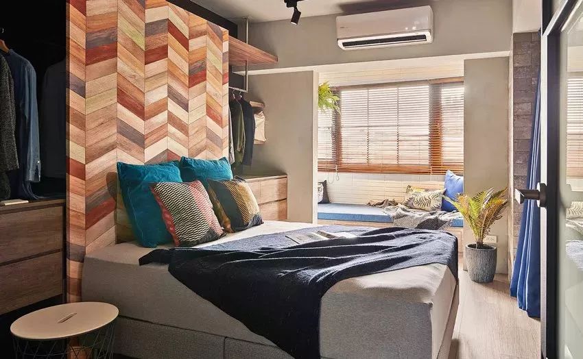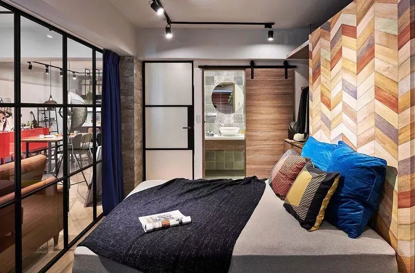 玻璃隔断门后面就是卧室,和客厅的复古墙相对应,床背后设置了木纹壁纸装饰的移动床头板,既是靠板也是衣柜的门板,一举多得,好看又实用。