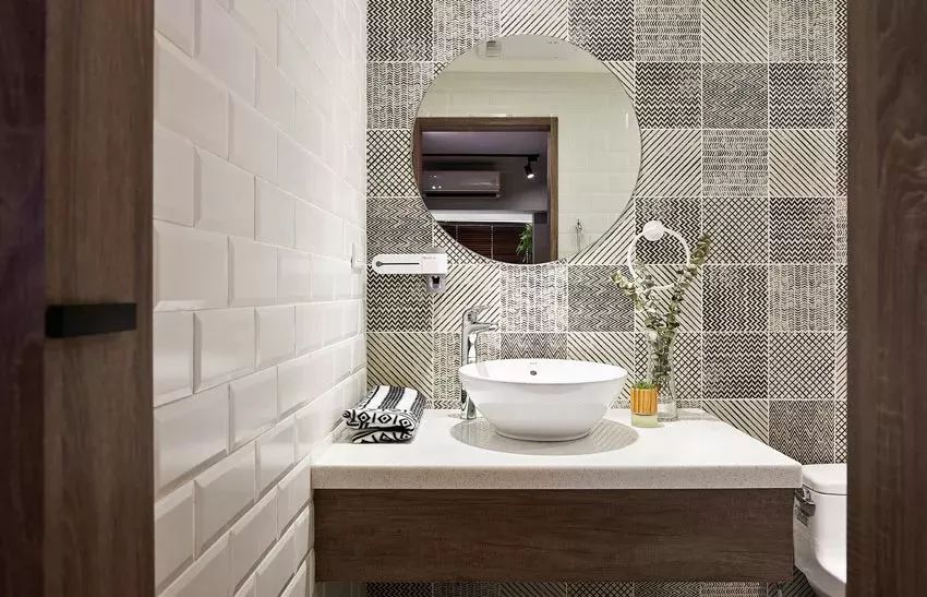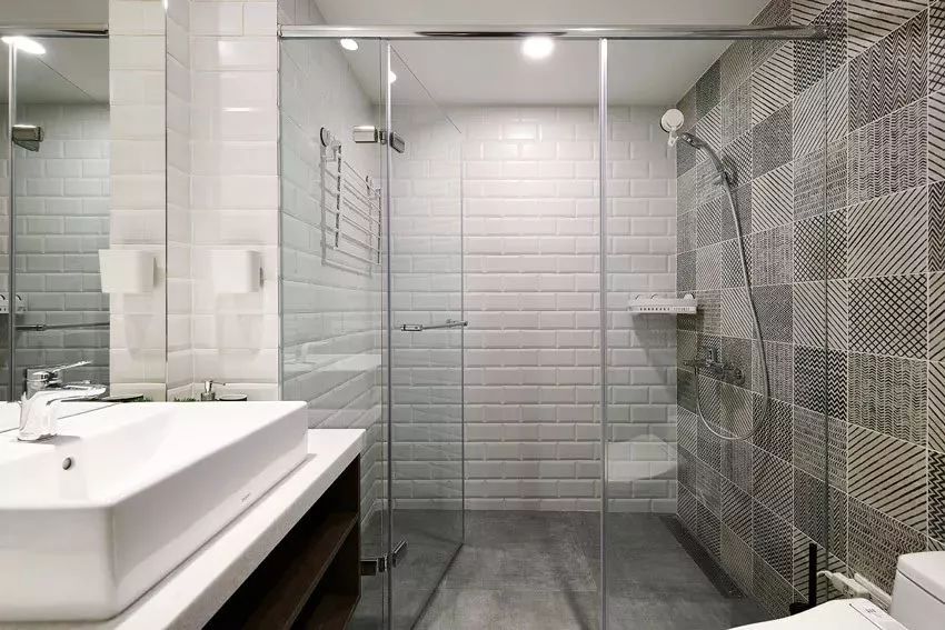 卫生间的设计较为简洁,主色调为原木色和灰白色。主次卫都选择了明亮饱满的白色面包瓷砖和手绘风的花砖来装饰墙面,大方之中又带着活泼的元素。