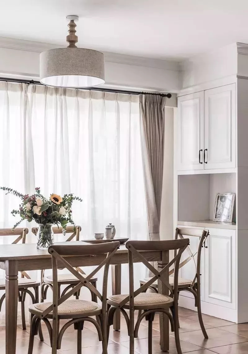 美式乡村风的餐桌椅,自然朴素,装点以美丽的鲜花,营造了一个让人心情愉悦的用餐空间。