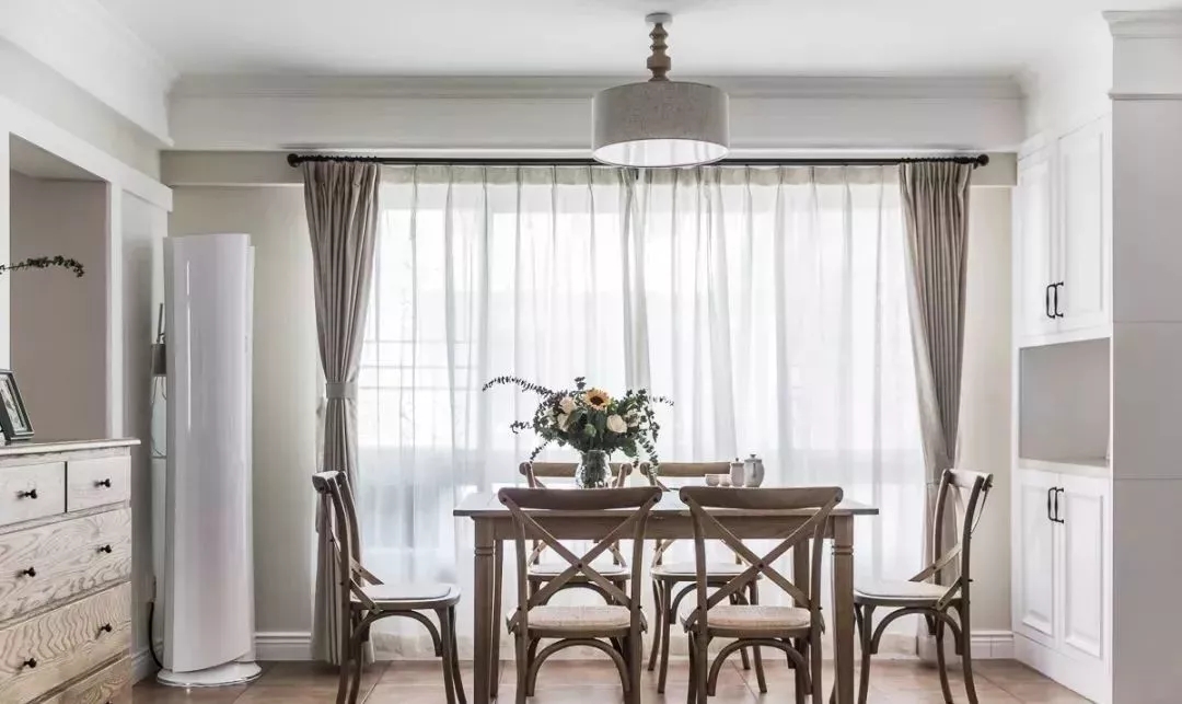 餐厅有一面大大的落地窗,窗帘选择了与整体色调一致素色,纱帘在保护隐私的同时也不影响采光。原木风格的餐桌椅令人在就餐时心情愉悦。