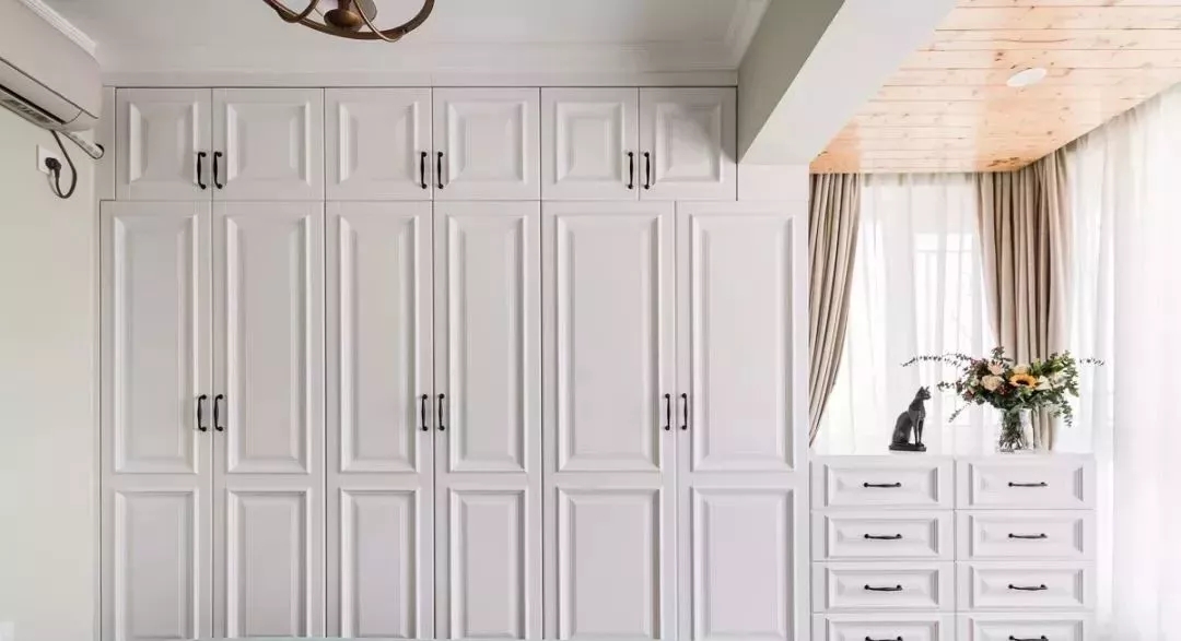 利用床尾凹位打造了一排入墙式衣柜,一直延伸到阳台,拥有超强的储物功能。
