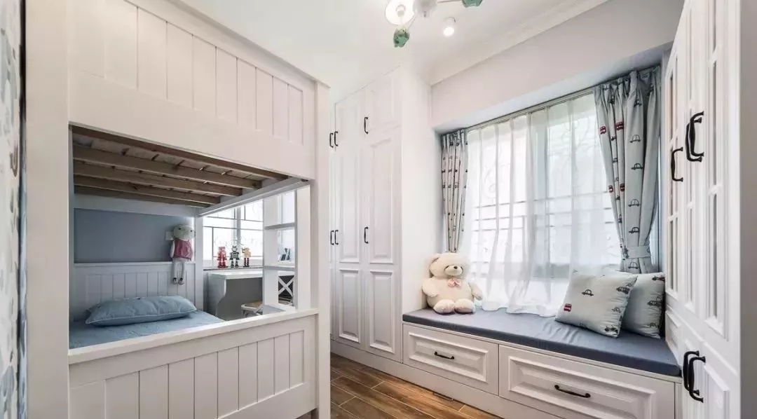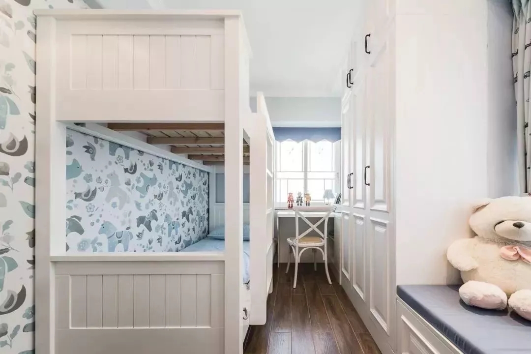 业主家有两个小孩子,双层床是最好的选择。靠窗打造了书桌+衣柜+飘窗+书柜,将空间利用到了极致。榻榻米的部分给业主的小孩子充分的游戏区,满足活动的同时还可以身心放松。