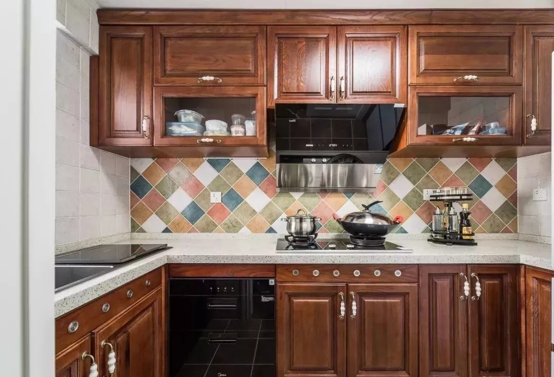 厨房是比较传统的美式风格,非常有质感。u型设计使厨房面积变的更大,下方的储物柜充分满足了存储功能