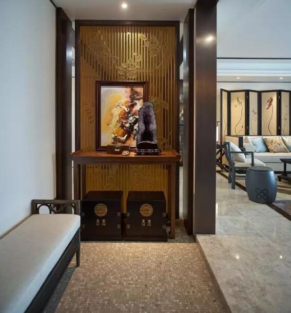 进门看见玄关处的摆设,就可以看出房间是中式装修风格。两个制作精美的古朴木质箱子,桌台上的假山造型、小鸟模型搭配在一起,给人印象深刻。精致的屏风配合户主的中式装修更显的优雅大气。枣红色的木质颜色不会显的家里暗,灯光的设置显得亮度也刚刚好。桌台上的水晶原石洞,代表着爱的守护石,赋予情侣或者夫妻之间深厚的爱,勇气与诚实。水晶洞因为造型切开如口袋,在中国传统意义上又称为聚宝盆,所以又有进财的意义。