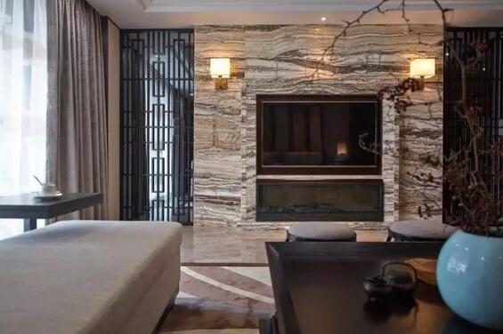 电视背景墙用带有纹路的大理石铺设,看上去很大气。两侧的铁艺装饰看上去与整体风格很搭。电视与背景墙融为一体,空间在视觉上放大许多。铁艺装饰使整个背景墙看起来更加时尚,让户主的家居生活更添一份现代艺术色彩。简单大方的款式,在任何的家居空间都能相辅相成的融合,彰显出不同的气质。