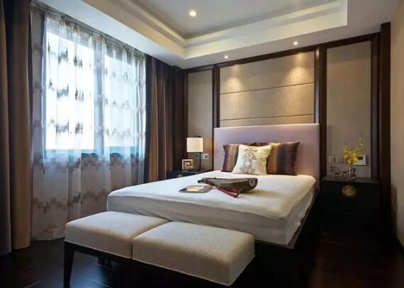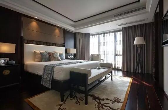 卧室装饰很大气古朴,装饰的很齐全,整体性很高。空调出风口放在是吊顶内层,不影响美观。