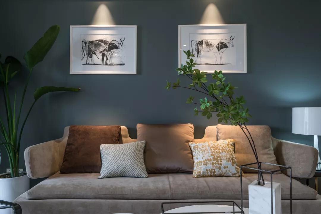 墨绿色的沙发背景墙左右着整个空间的格调,搭配咖色的沙发和地毯,优雅复古而不失品质感。