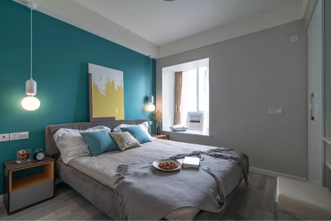 主卧蓝色的床头背景,搭配一幅明黄色的装饰,色彩对比强烈,营造出格外亮眼的视觉效果。