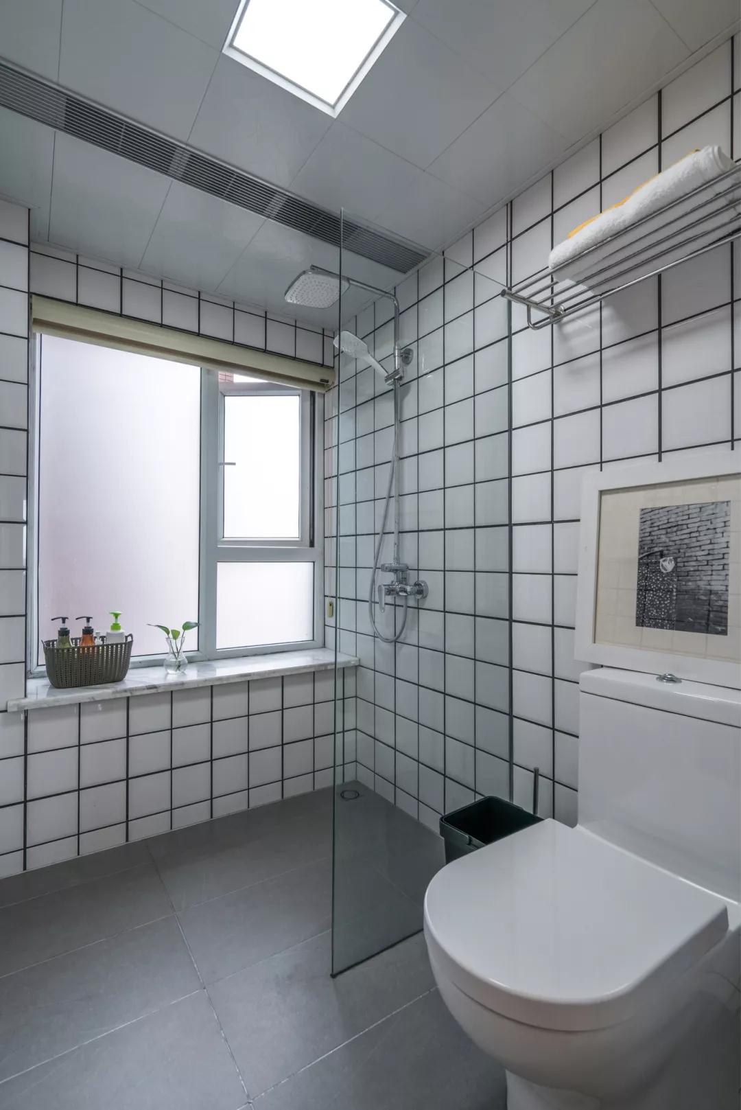 卫生间用一块玻璃作为干湿区的隔断,灰色地砖搭配白色小方砖,简洁而不单调。窗台加宽用于放置洗浴用品。