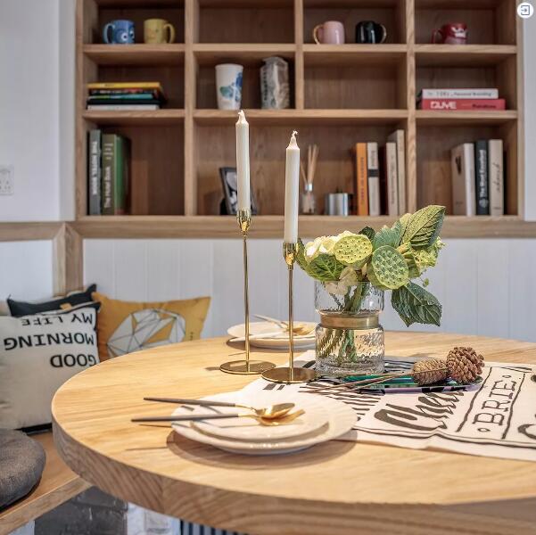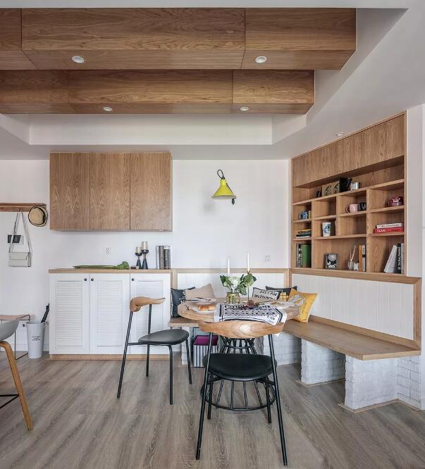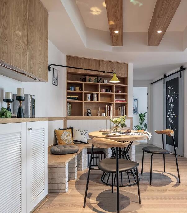 ▲独具创意的餐厅设计,改变了原本空间结构,入户走至房间方向形成S形动线,让一进家门的视觉延伸更有想象空间。整体餐厅的色调选择的原木色调,家具也全部选择了北欧风格特色的高脚的桌椅,让整个空间更宽阔。