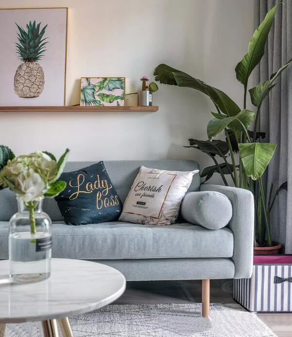 ▲为呈现业主喜爱的简约自然风,客厅运用颜色温和的布艺沙发,点缀少许金色元素,让空间更显精致优雅。北欧风格中绿植是必不可少的,所以选择了许多的绿植作为装饰,让整个空间更加有生机,所有绿色系的物品在客厅完美的融合,不会让人感到太过浓重。