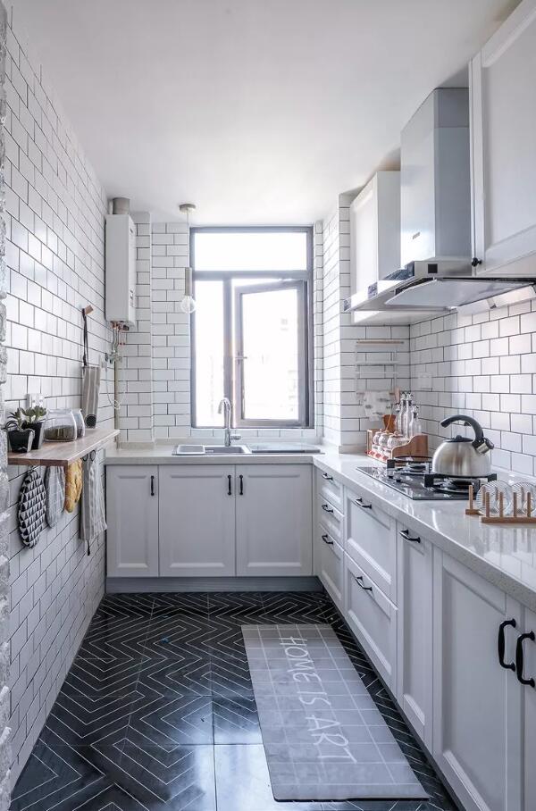 ▲L型功能厨房,处于半开放状态,不仅保证了空间的透亮,更与餐厅形成良好的沟通对话。厨房的整体色调为白色,让厨房整体看起来更加干净整洁。底部橱柜更好的有利于储存收纳,使整个储物空间更大,让整体空间更加宽阔。