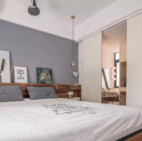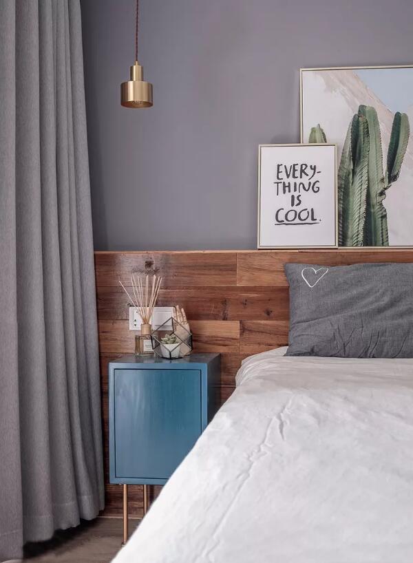 ▲全屋最好的阳光让主卧空间从早暖到晚,静谧的色调赋予了主卧宁静的氛围,而金色细节的点缀则平添几分优雅气息。卧室背景墙选用了高级的灰色作为主调和窗帘床品部分交相呼应,墙上装饰画的设计不会让主卧变得死板,让主卧更加看起来赋予现代感。