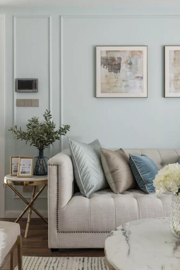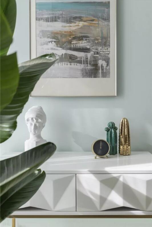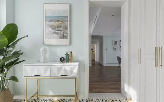 门厅空间为异形空间,面积充足,所以在右侧依墙形状设立收纳柜,可作为鞋柜、进出换装以及收纳空间使用。满足业主的对于收纳的欲望同时在增加美观的基础上有扩大了空间的实用感。背景的装饰画和桌面上的陶瓷装饰品是十分具有美式风格装修的小物品。背景墙选用薄荷绿色作为基础色,是整个客厅更加清新,不会像传统的美式风格沉闷古板。