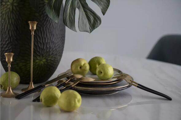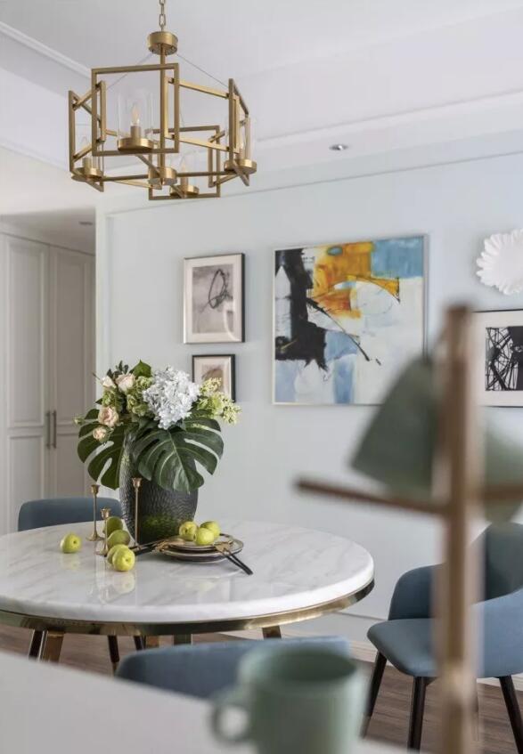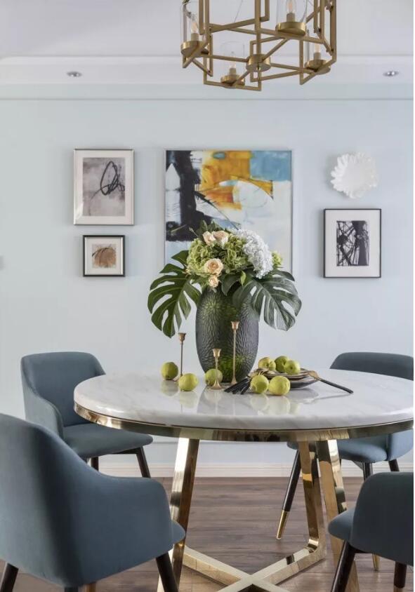餐厅选用圆形餐桌,可以柔化方正空间的硬朗棱角。餐桌选用了和客厅一体的大理石台面,配合蔚蓝色餐椅作为深色出现,餐厅空间颜色深浅搭配,突出空间重心。烛台花瓶的出现体现了女主人对于整个生活的品质感的把控。