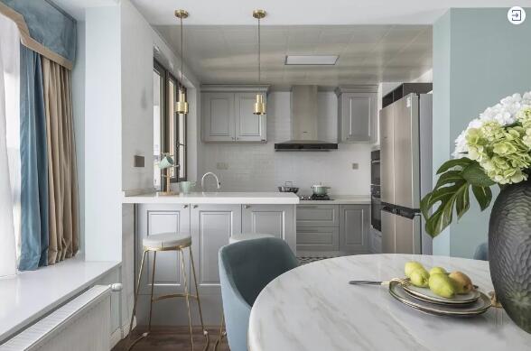 餐厅正对厨房,厨房做成开放式设计,增添了明亮的光线。同时在左侧增设吧台,不仅提供了更多的食材操作空间,也增加了家人之间的情感交流。冰箱烤箱贴墙内置放置更好的把空间的利用率变大。吧台下方包括厨房台面下方的收纳空间也很好的利用上去,再也不用担心因为收纳所带来的问题。