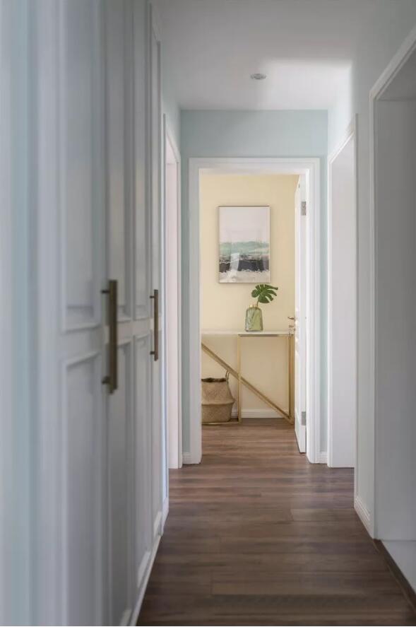 走廊量身定做了柜子,隐藏着巨大的收纳空间,嵌入式的设计以及白色的柜门保持走廊整洁的观感,低调却又不是内涵。