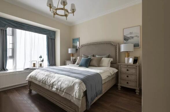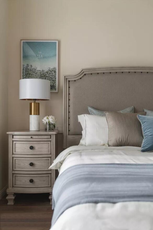 主卧选用米黄色墙面,色调温馨自然,符合人体视觉感知。家具选用木纹质感,提升空间品质。雾霾蓝作为软装色系出现,使卧室空间氛围沉静、温柔。主卧和客餐厅明显不同的是,主卧更加的温馨让人一进入就感到身心沉静,不像客餐厅那样让人身心舒畅,心情畅快。