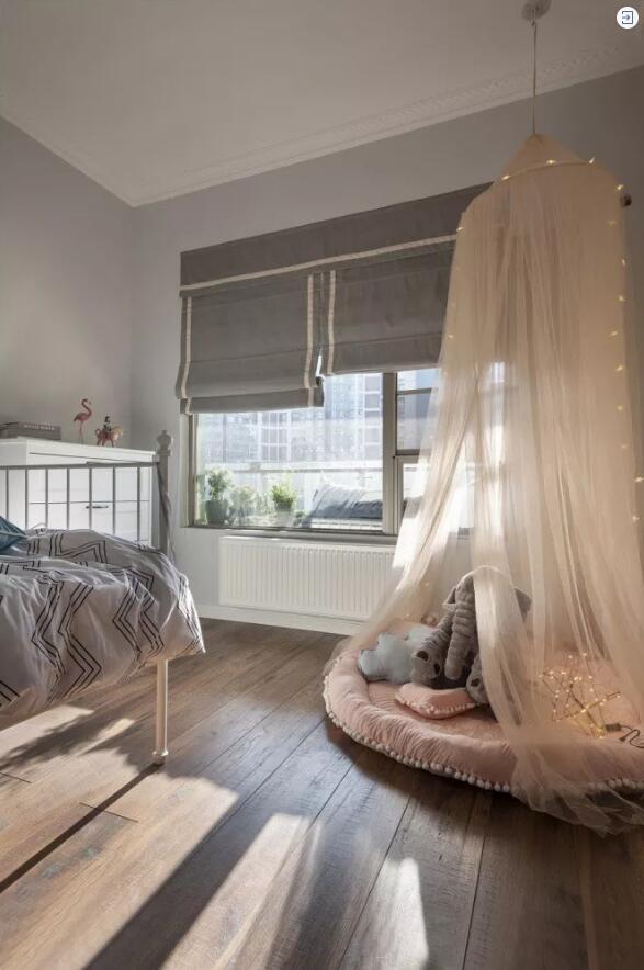 女儿房选用铁艺床,节约空间的同时,也便于日后女儿长大更替家具。角落利用粉色小帐篷打造玩具区角,将空间合理规划,便于日常整理。