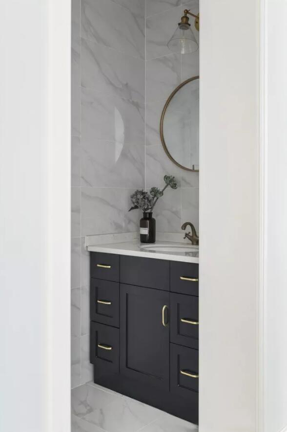 卫生间选用大理石瓷砖搭配黑色浴室柜,深色系便于清洁,抽屉式收纳柜利于分类使用,使空间更加干净整洁。