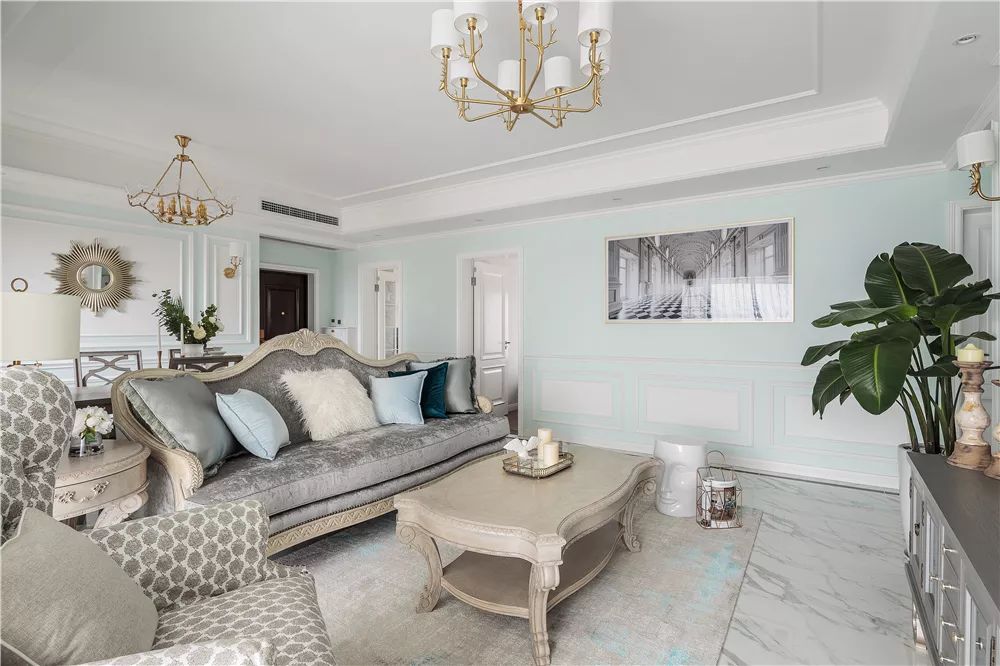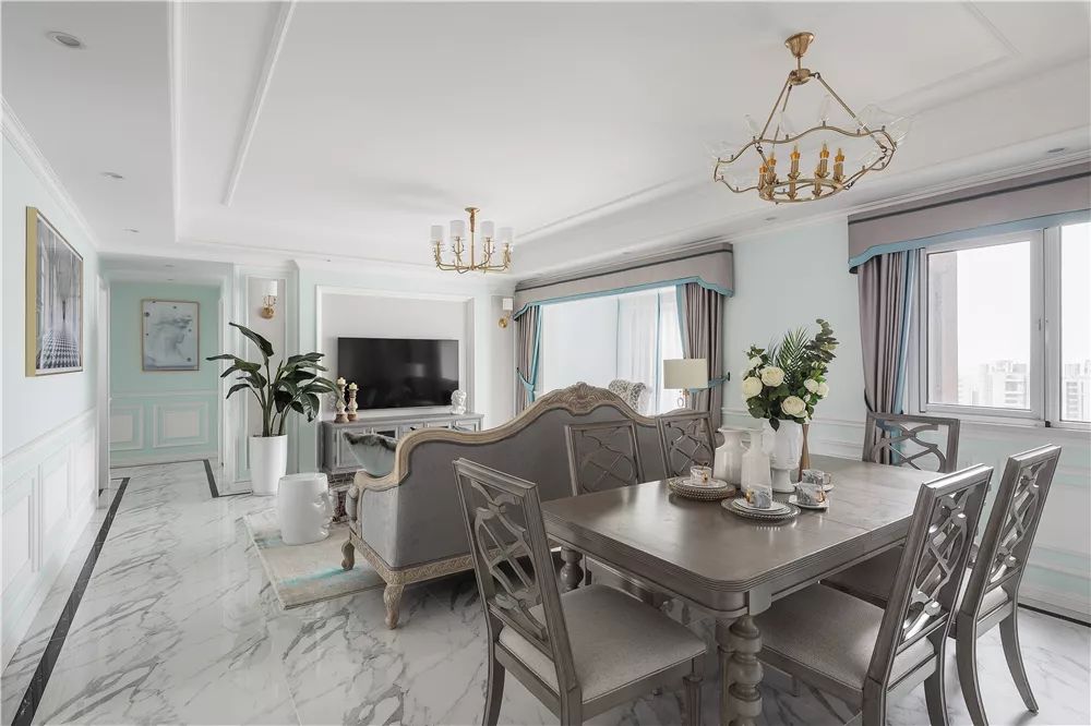 2、客餐厅铺上大理石砖,时尚有范儿。美式家具端庄优雅。
