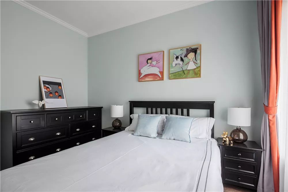 ▲儿童房选择黑色实木家具进行搭配,在浅绿清新的基调下显得尤为休闲舒适。墙面融入了两幅可爱的装饰画,让空间多了些活泼灵动感。