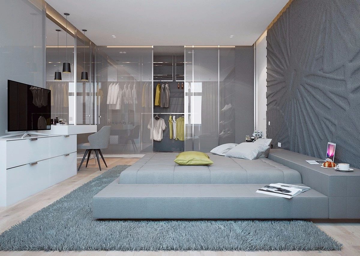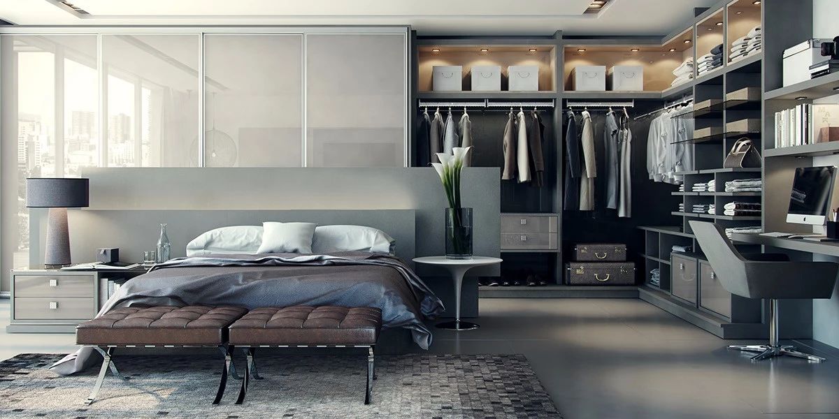 卧室的床对面也可以设计成开放式衣帽间,搭配简洁的玻璃推拉门设计,非常方便实用。