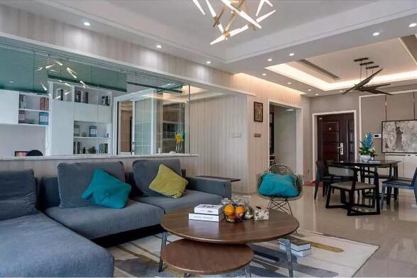 ▲沙发墙与隔壁房间的墙体拆了一部分,取而代之的是通透的玻璃,让整个空间看起来更宽广。