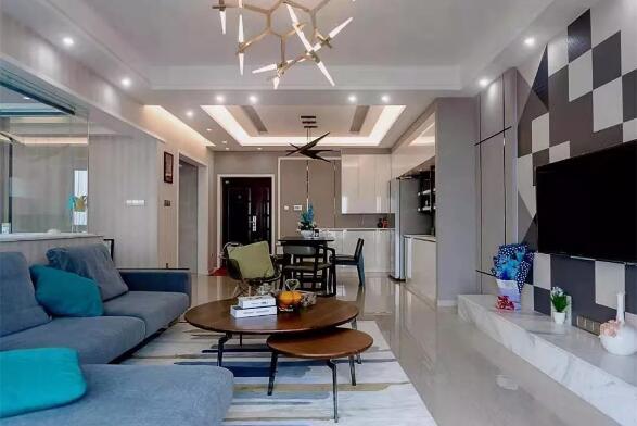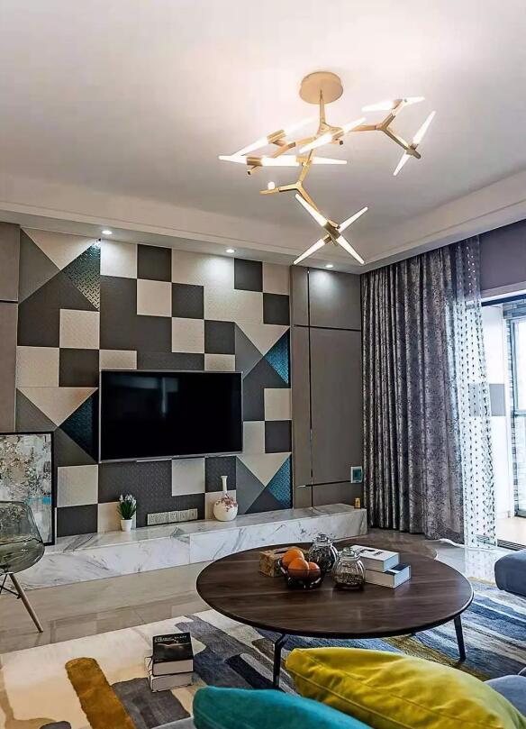 ▲不张扬也不低调,所以客厅有一套低调舒适的沙发,还有一盏个性时尚的吊灯,更有一面立体感很强烈的电视墙。