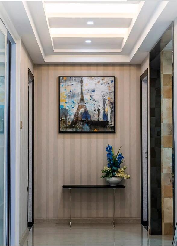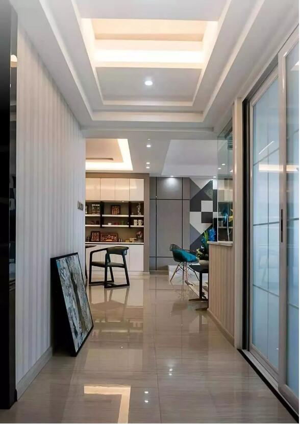 ▲过道的天花采用跌级吊顶,照明方式采用灯带结合筒灯,软硬装结合打造出一个层次感强烈的空间。