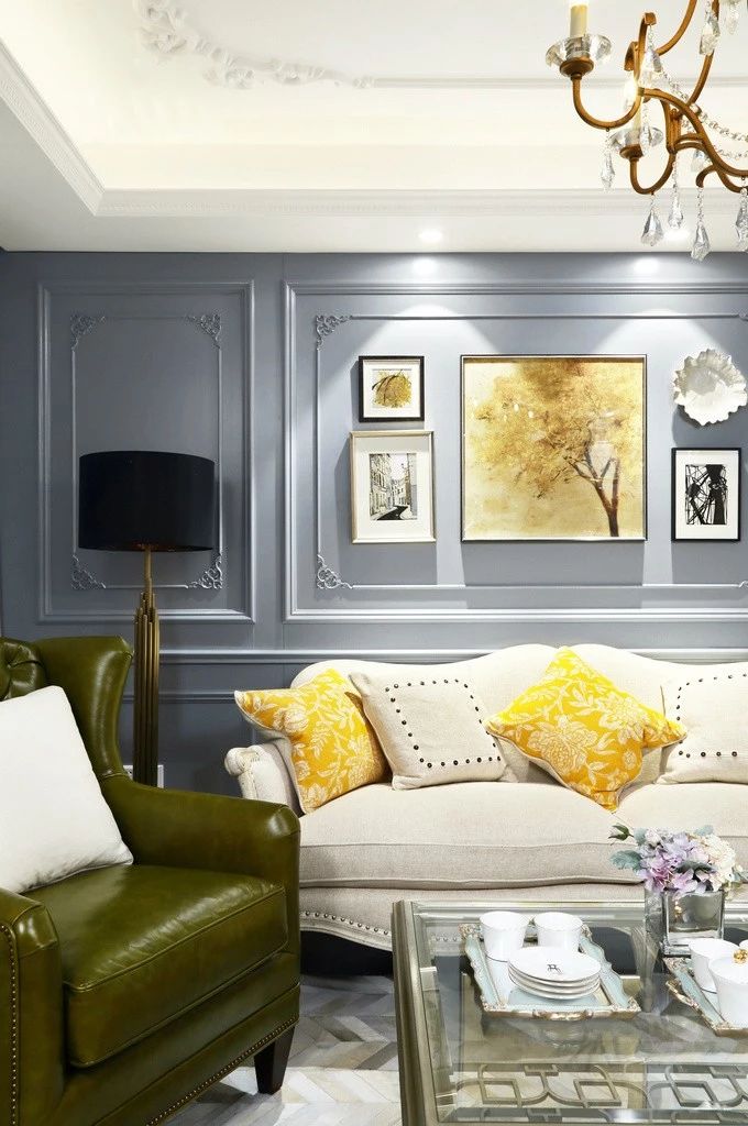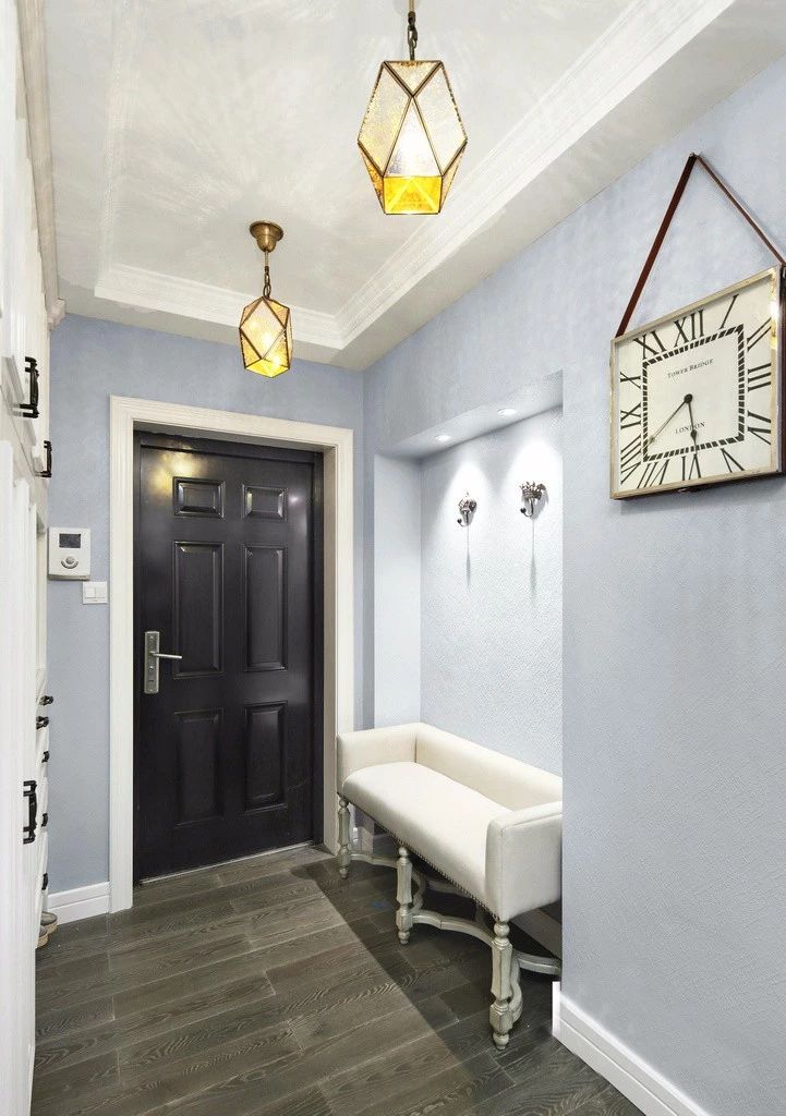 ▲玄关左侧是收纳柜,右侧精致的布艺沙发,可以坐着换鞋,好看实用。搭配几何吊灯和时钟一进门就可以感受到满满的法式风。