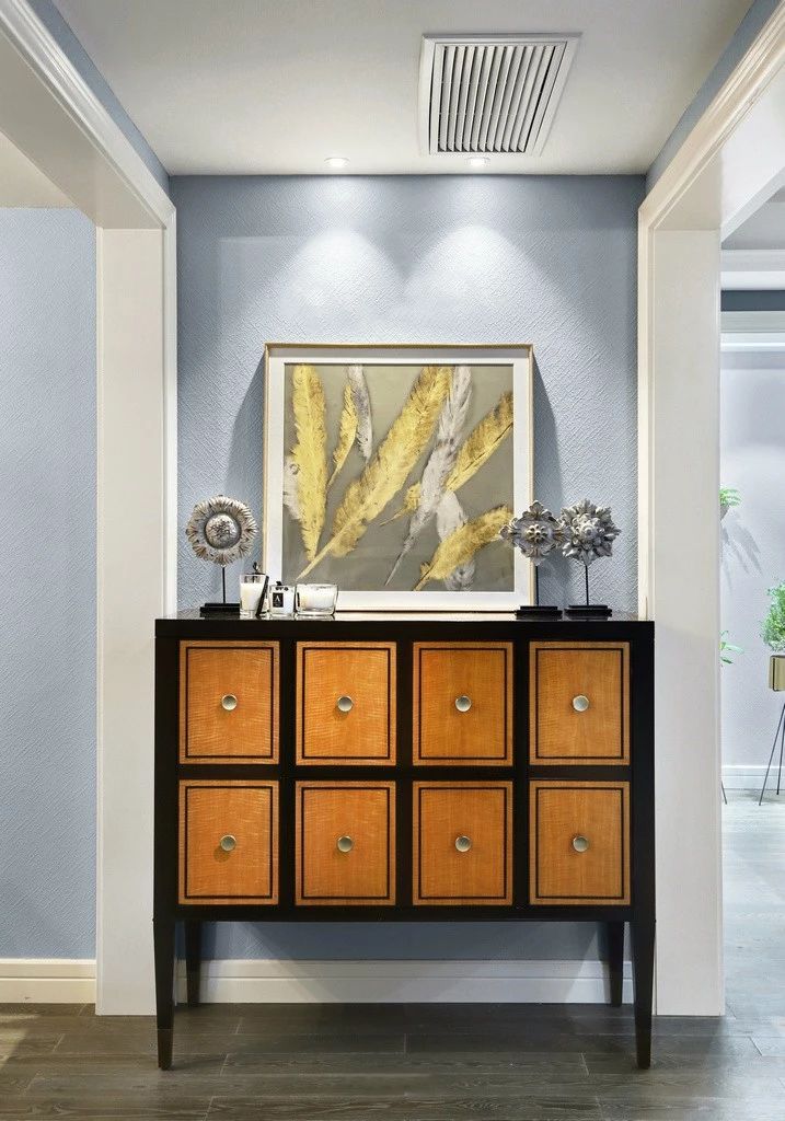 ▲黑色+橙色搭配的玄关柜,放上几个摆件以及金色的挂画作点缀,尽显艺术气息。