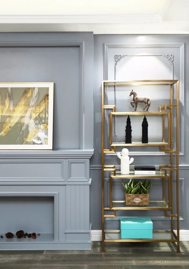 ▲右侧一个金属边置物架放满了各种装饰品,书、绿植、特色摆件等等。