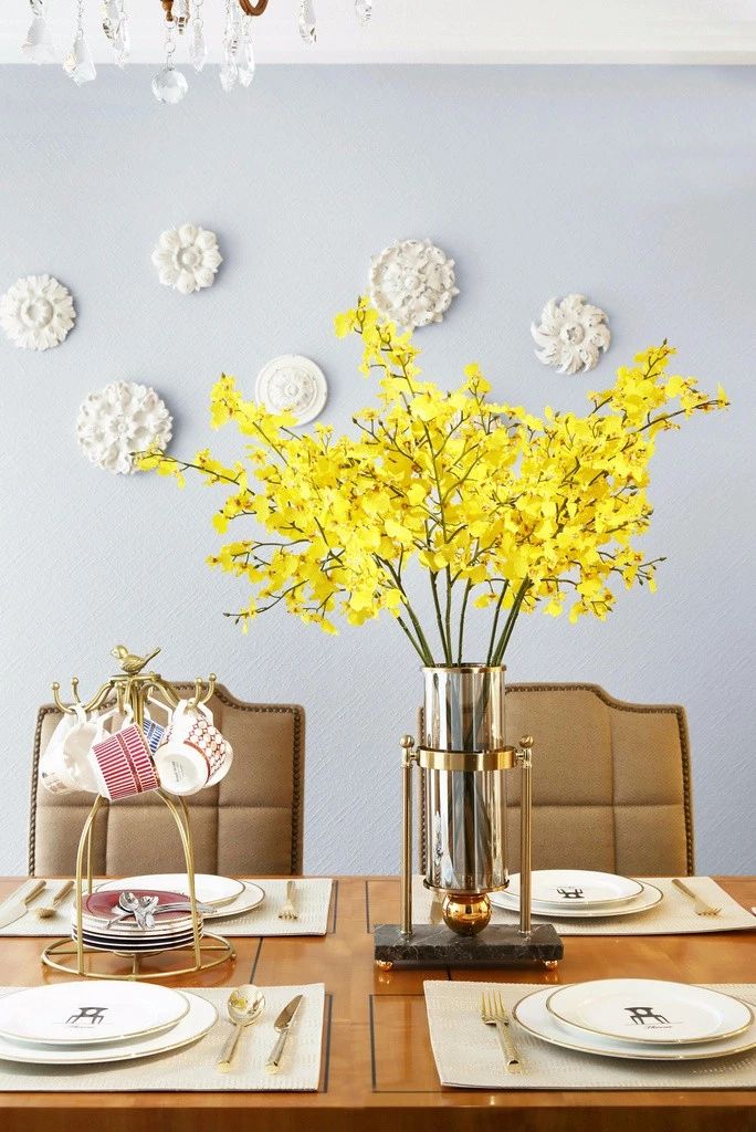 ▲金色的餐具、餐盘和杯架等,都与黄色跳舞兰一起,营造出一份独有的精致与轻奢。