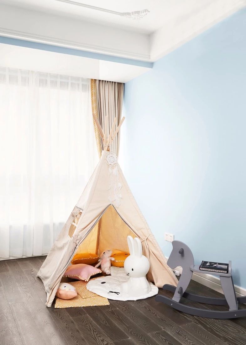 ▲儿童房,DIY简易帐篷,旁边放上一只小木马,房间角落成为了孩子嬉闹玩耍的天地。