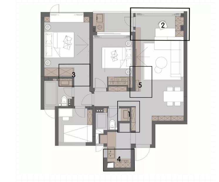 3、主卧利用衣柜设计增加嵌入式移门,平时可隐藏变成套房形式;