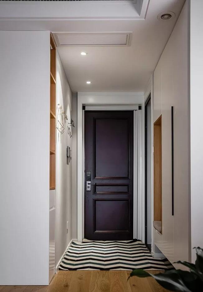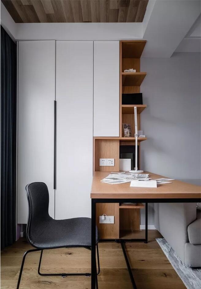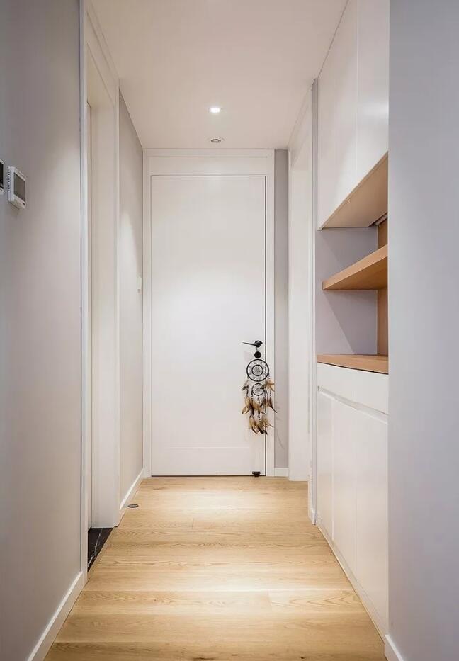 把主卧和书房合并成套房后,走廊底部就是主卧门了,次卧的墙面外侧做了嵌入式柜,把走廊的空间也利用来收纳。