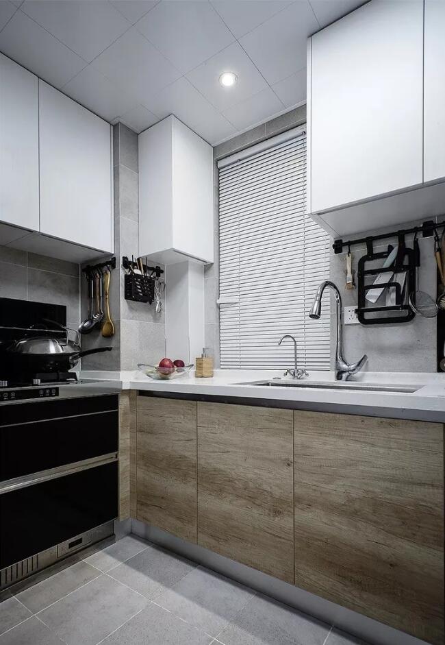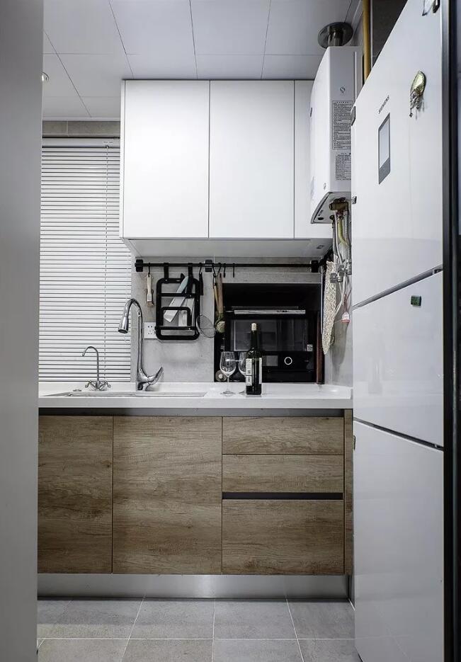 白色操作台让厨房色彩过渡自然,利用卫生间飘窗位置放置微波炉,充分利用空间提高了厨房的实用功能。