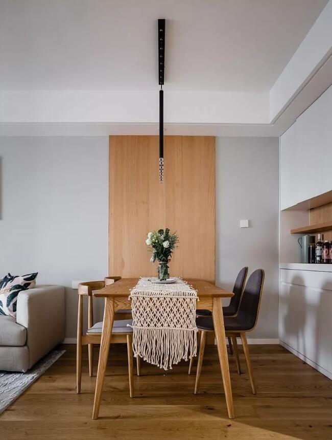 餐厅装饰元素少,大量留白,更多的利用直角线条打造出美感,简单搭配就有了这个实用美观并存的温馨之地。
